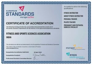 CERTIFIED PERSONAL TRAINER, CERTIFIED GROUP EXERCISE INSTRUCTOR, CERTIFIED FITNESS TRAINER, PILATES TEACHER, PRE & POST NATAL EXERCISE. FSSA Council is fully accredited by EUROPEACTIVE to deliver these qualifications and the graduates can gain their membership and listing with the prestigious register.